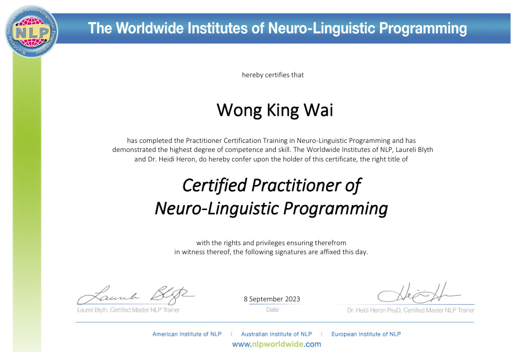 Wong King Wai is a Neuro Linguistic Programming (NLP) practitioner who completed his certification at the NLP Worldwide in Sydney, Australia in 2023. Since then he’s been coaching and helping others on an ad hoc basis before starting to make it his mission to help as many people he can in 2025.